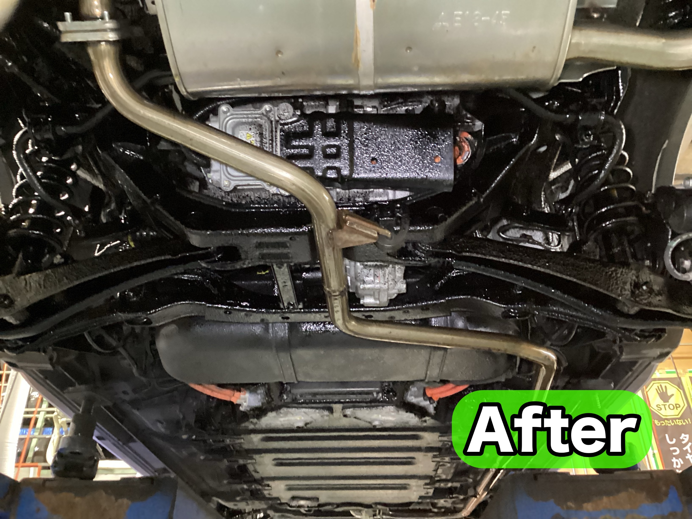 ↑翌日、半日かけて黒塗りをしました。PHEVなので、下回りが複雑な構造です。