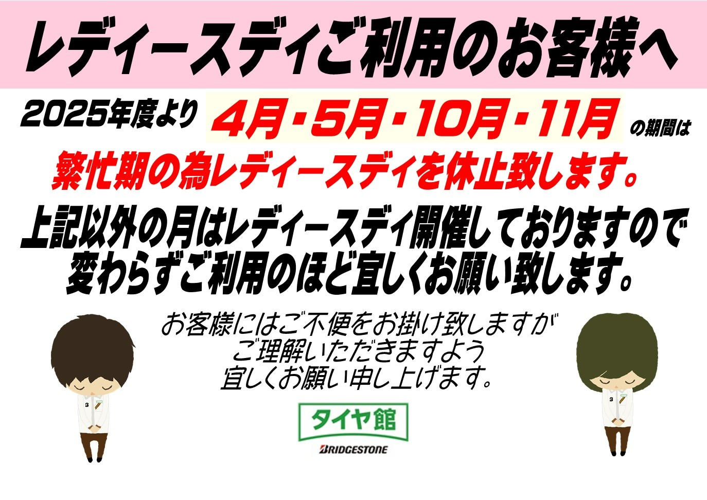 4.5月と10.11月の期間はレディースディはお休みさせていただきますm(__)m