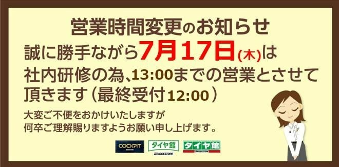 7月17日(木)の営業時間は13時までとさせていただきます。
