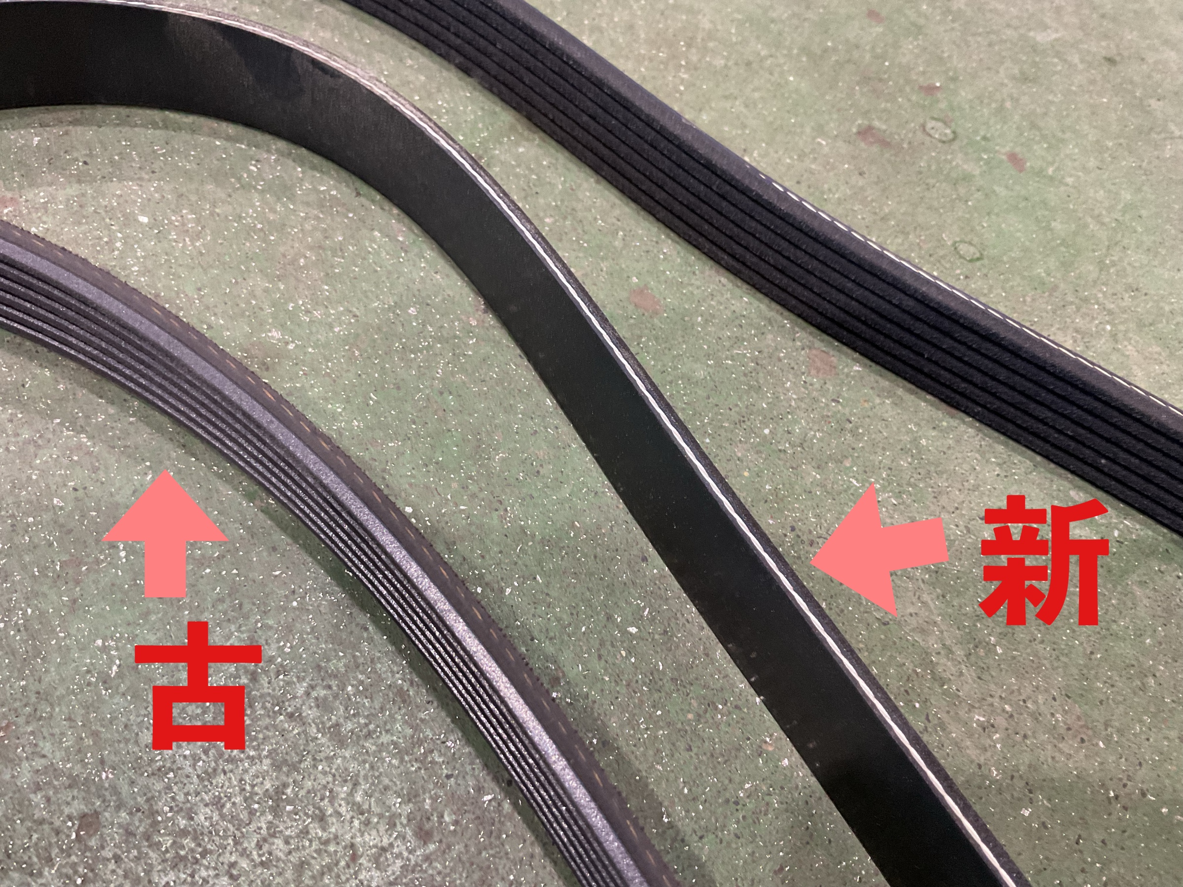 やはり新品の方がゴムの色が濃く、古いベルトは細かいひび割れも発生しています。