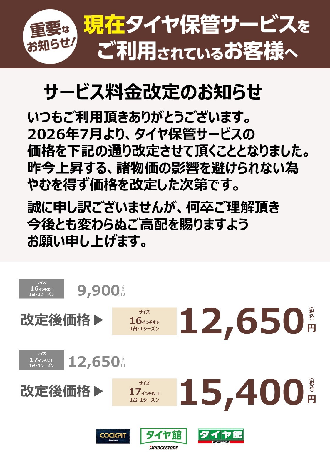 当店からのお知らせ!タイヤお預かり料金の価格改定!