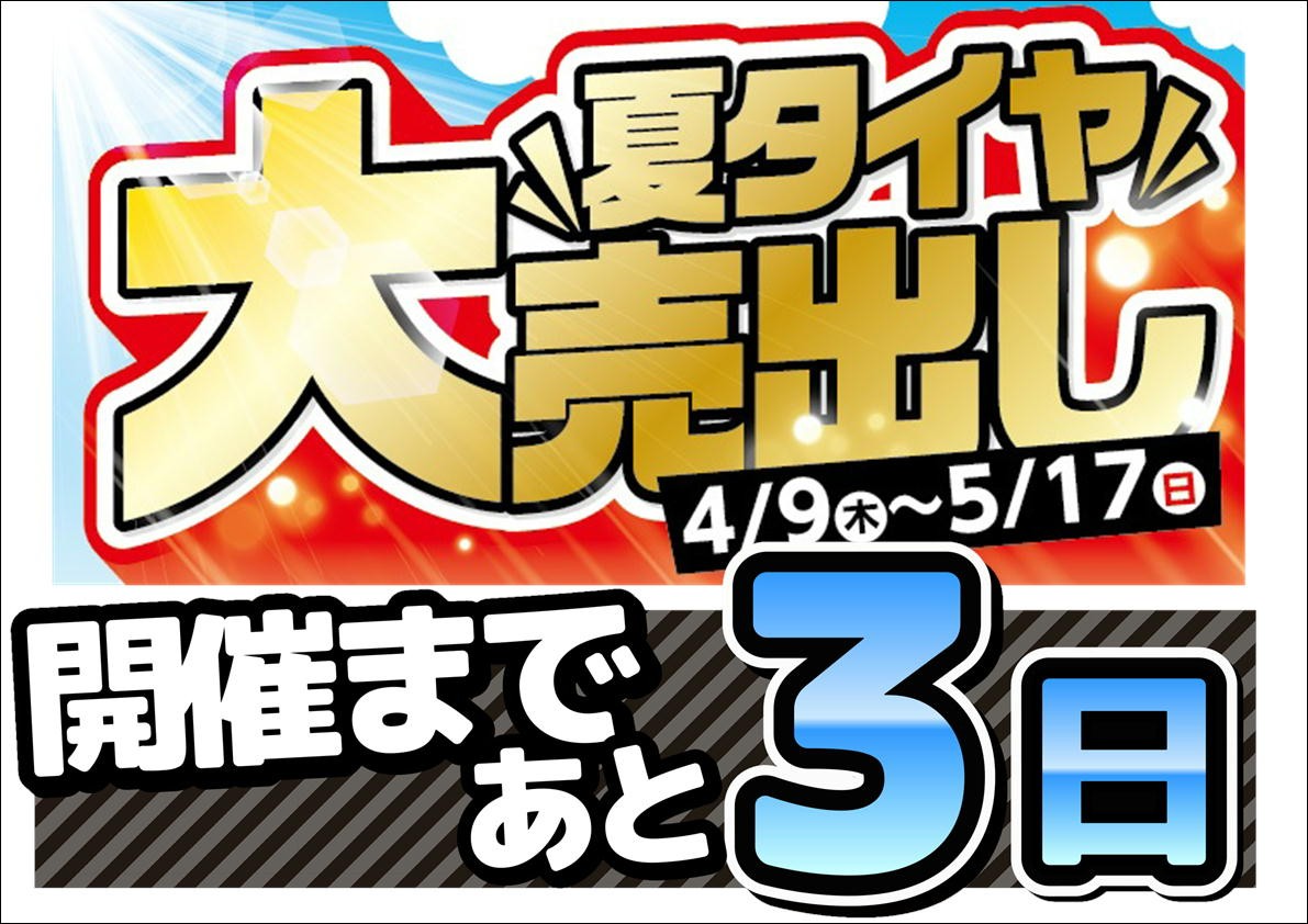 夏タイヤ大売り出しセール開催まであと3日!!お見積りだけでもお気軽にご来店ください☆