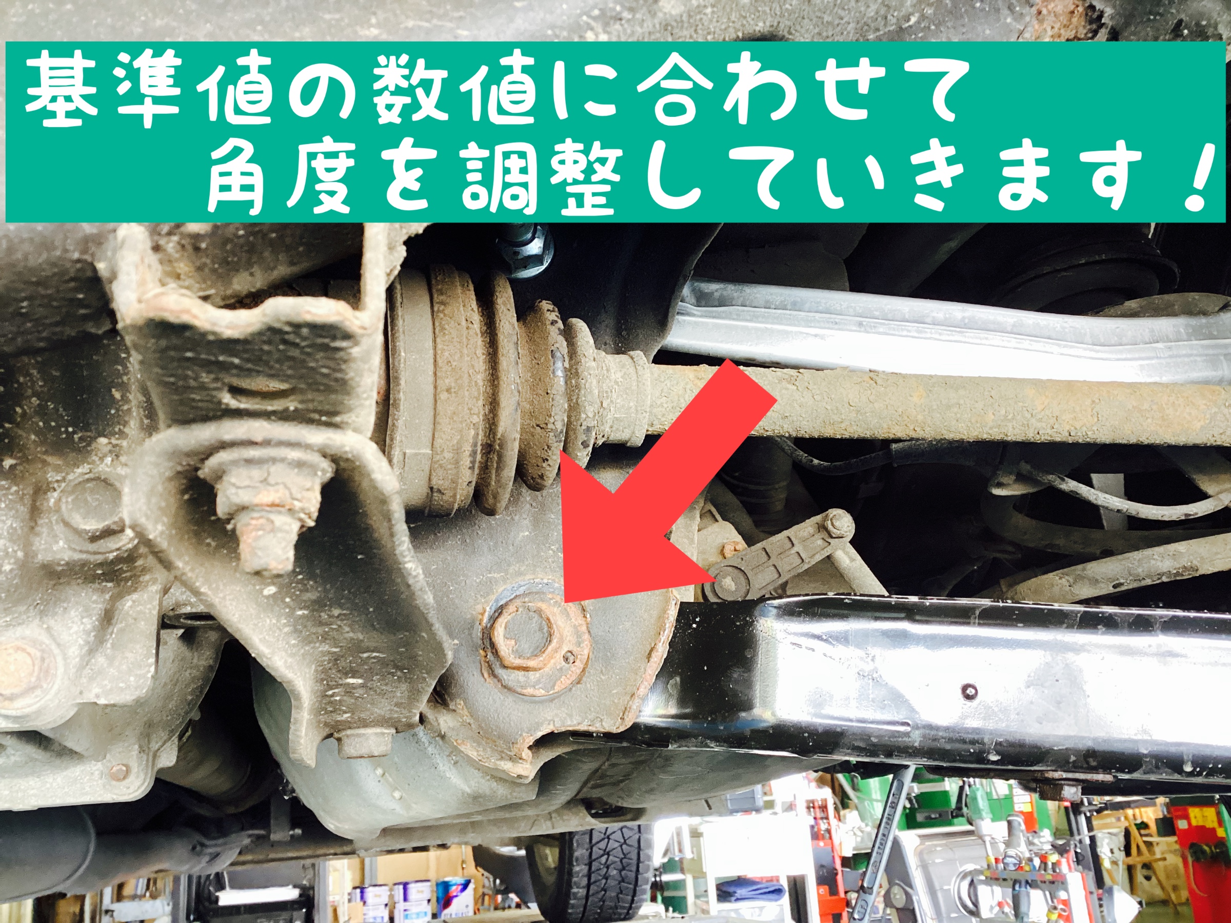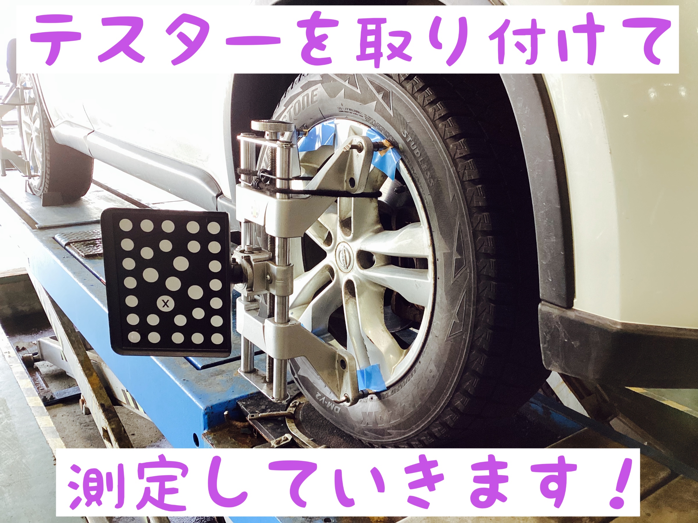 当店では、お車のアライメント点検や調整作業を