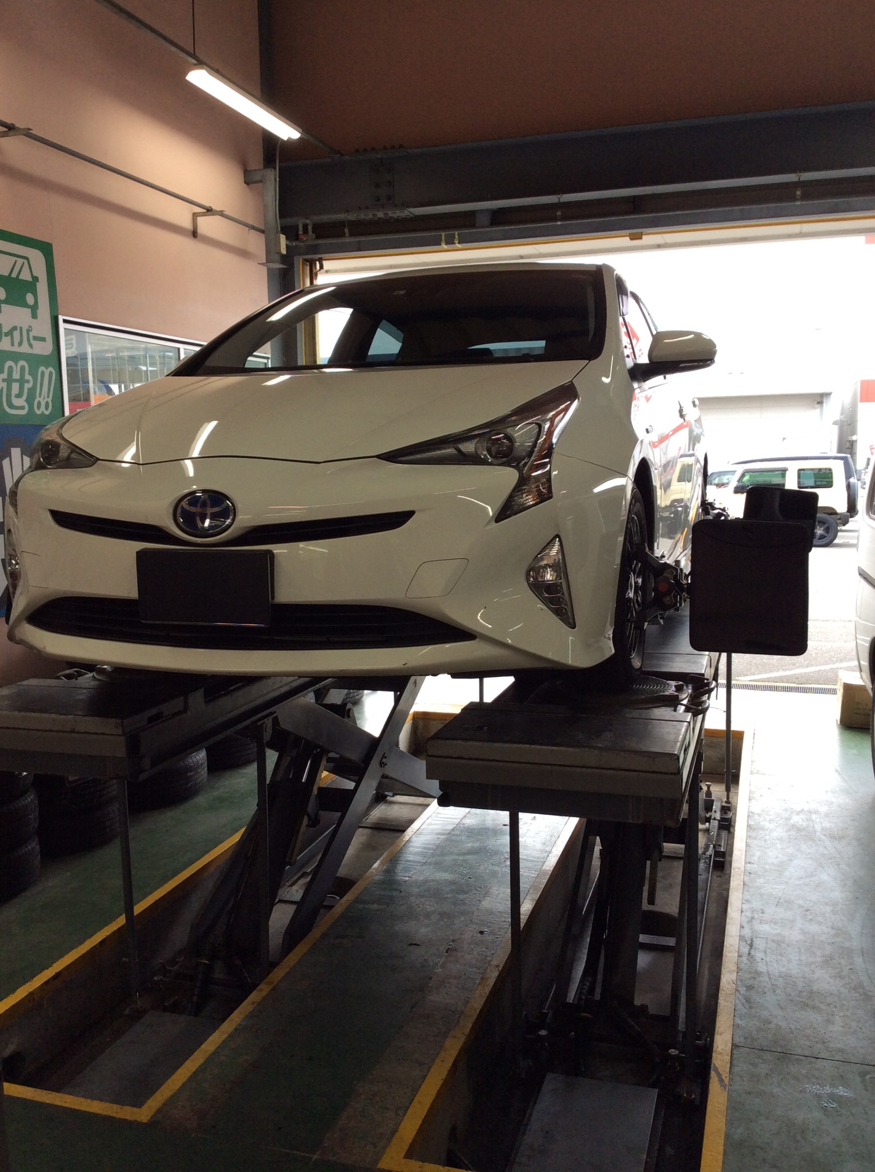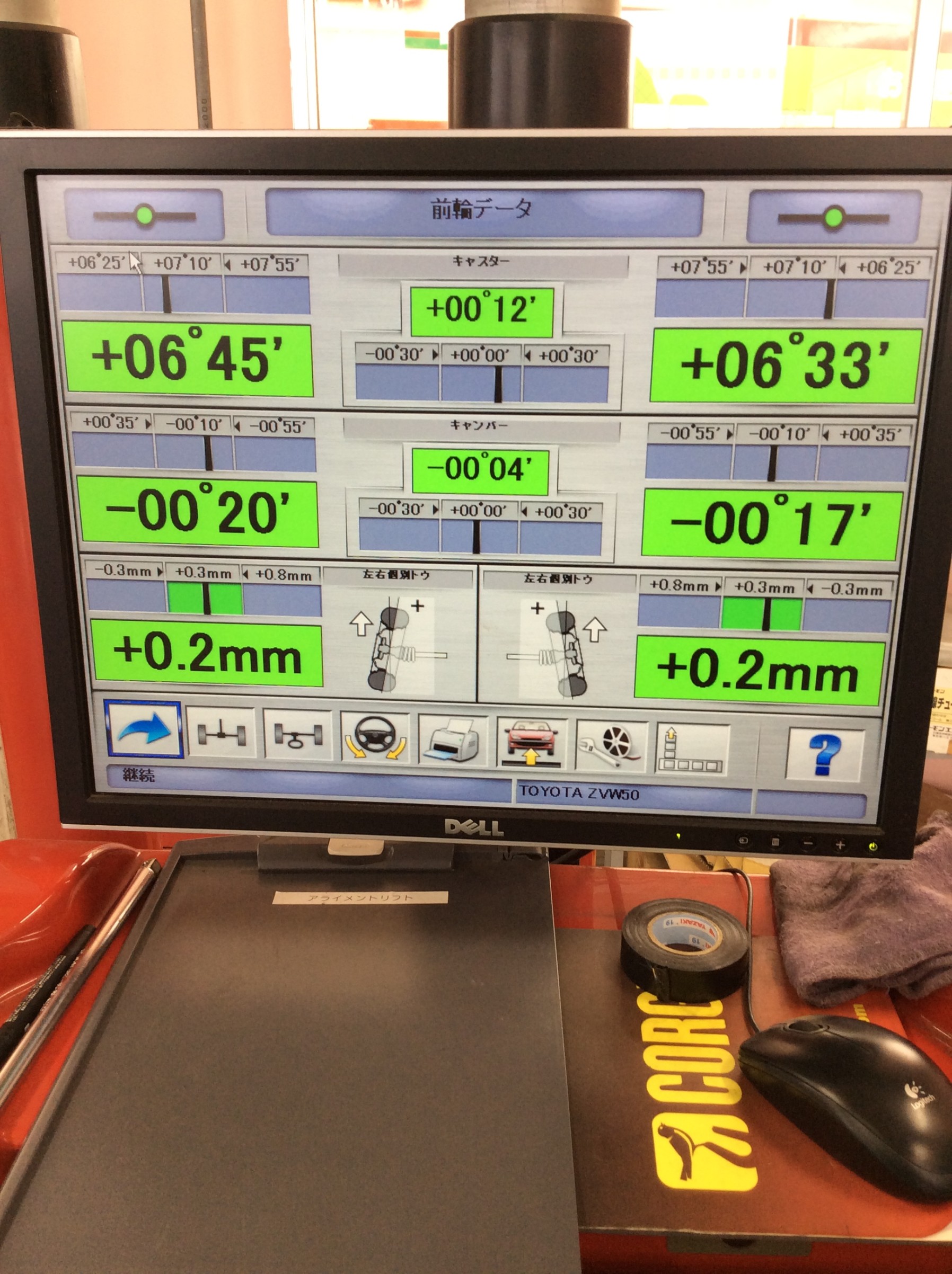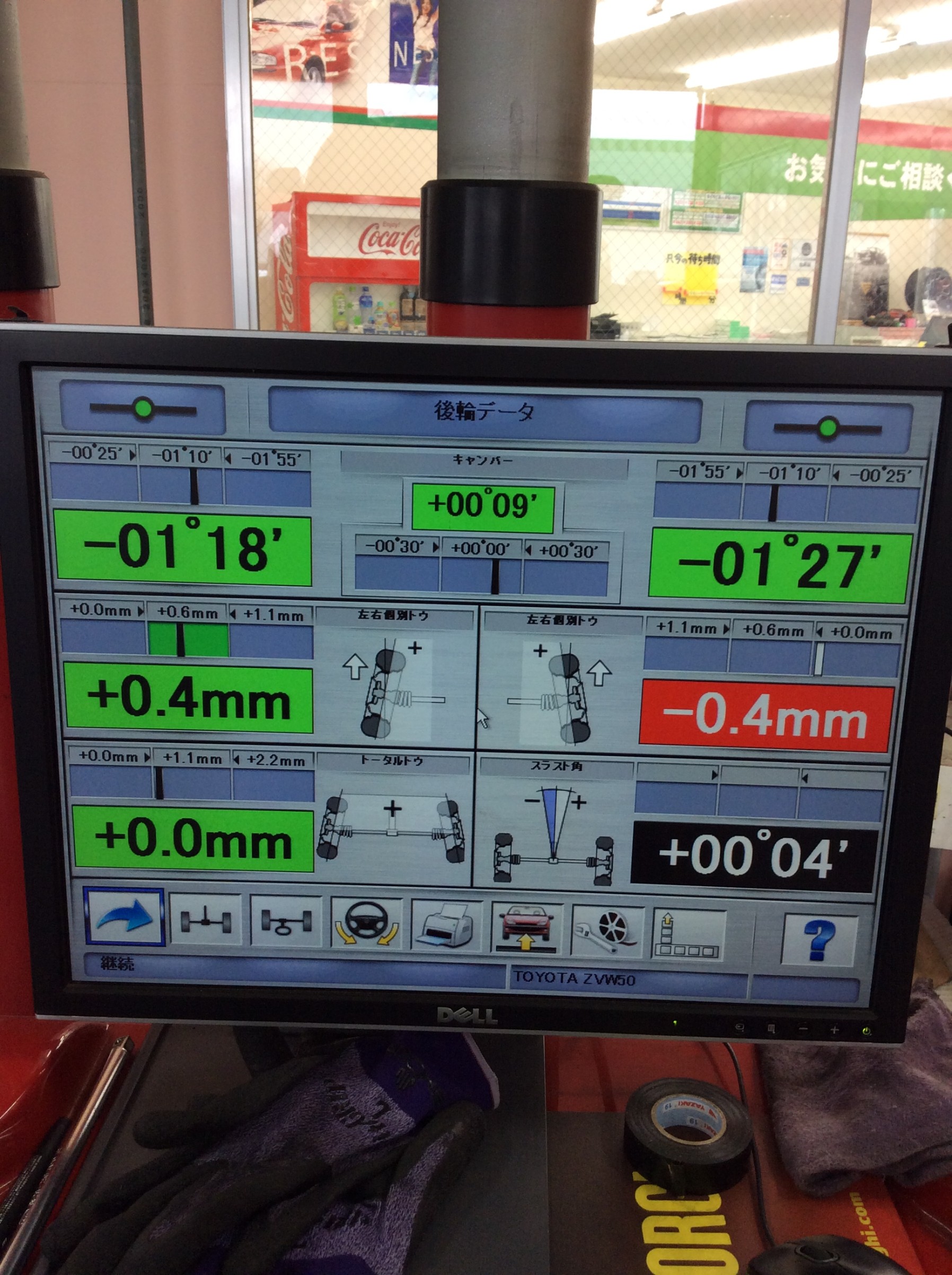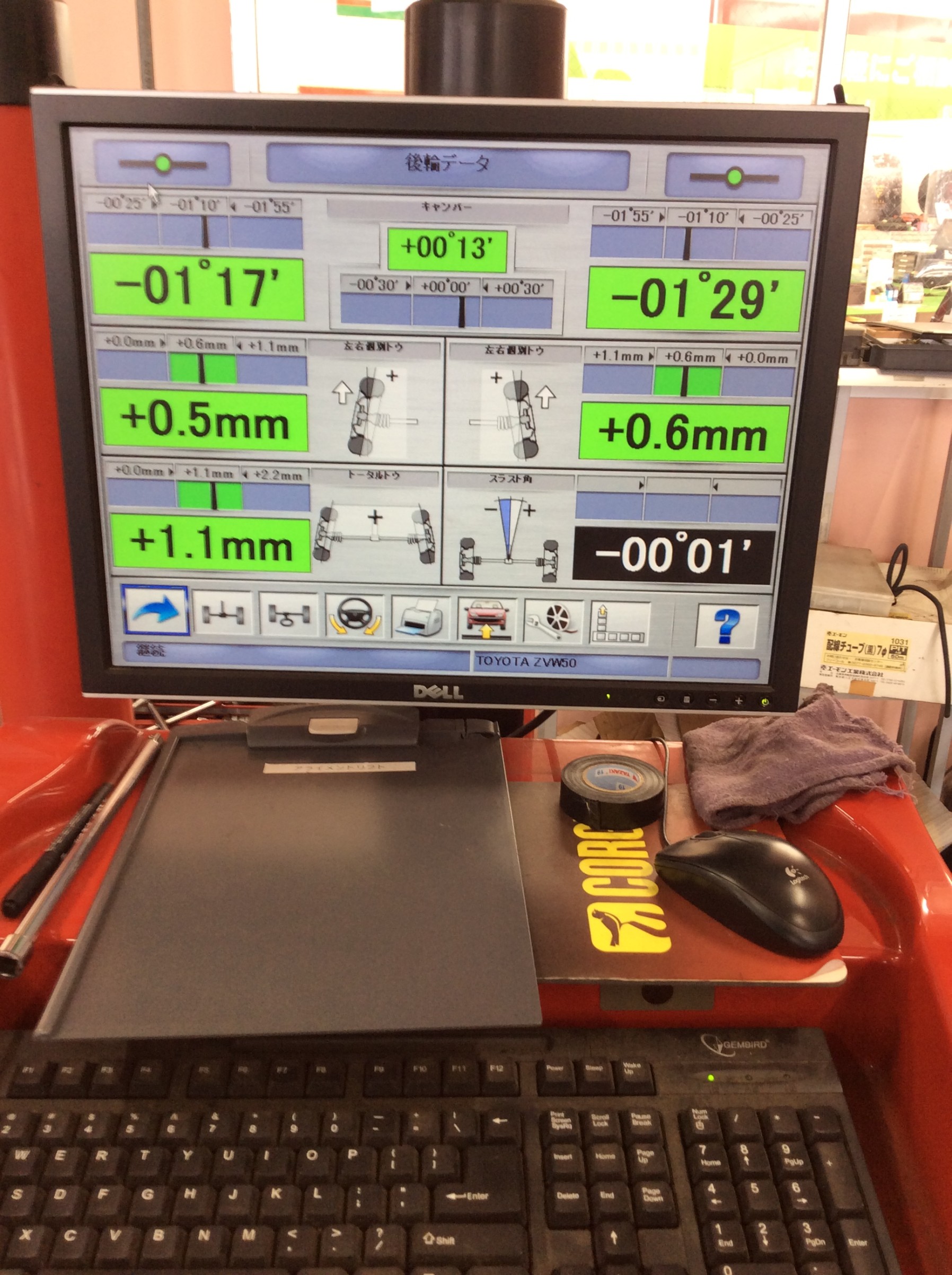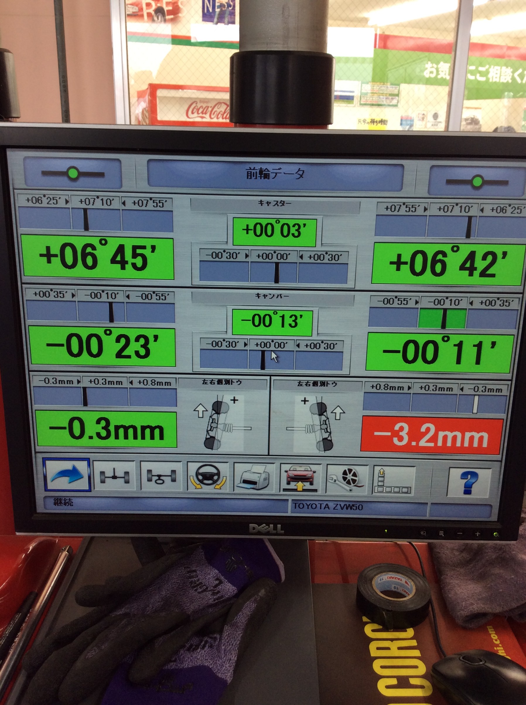 今回はダウンサスから純正のサスに戻したためアライメントを取ります。
