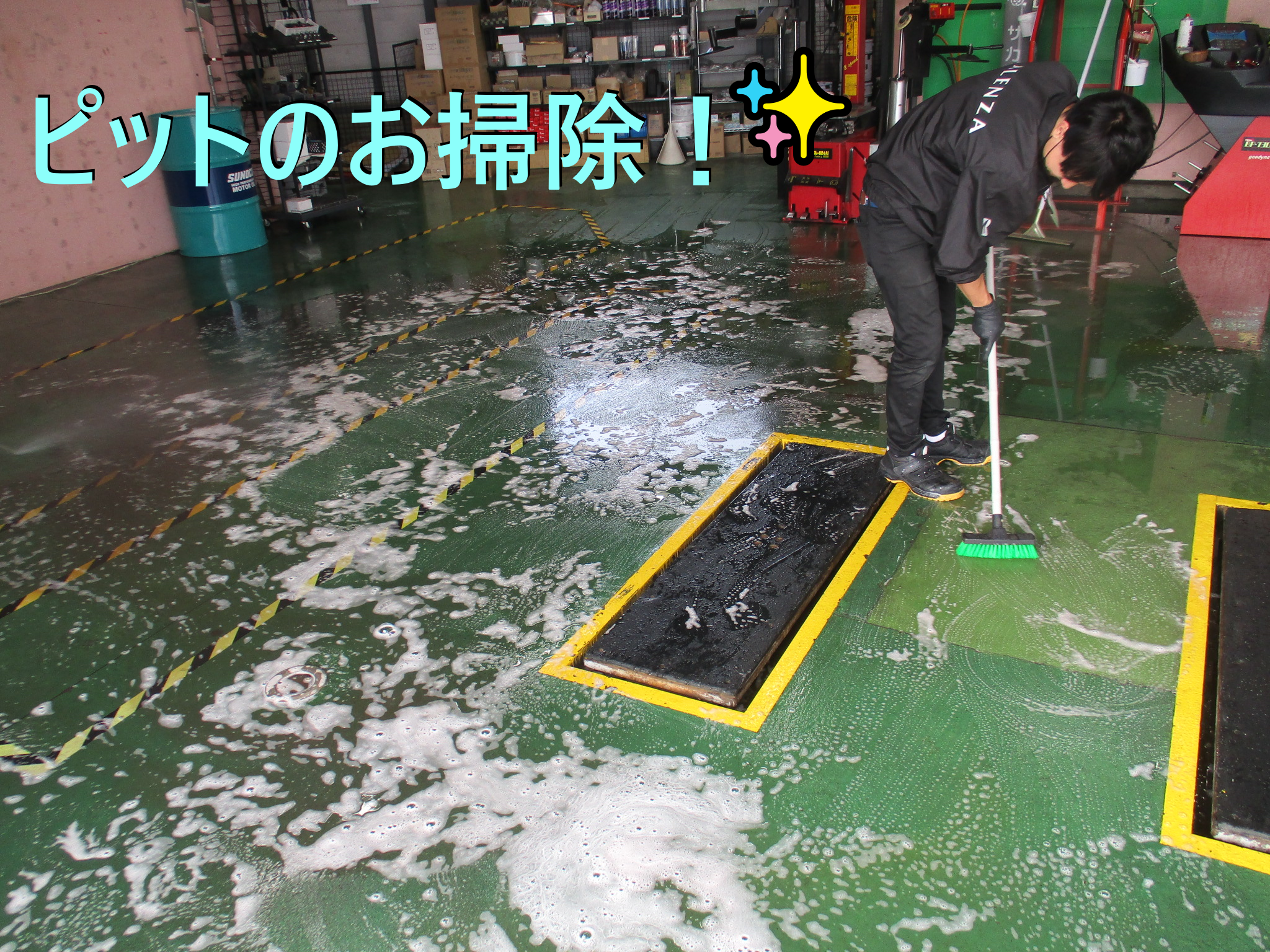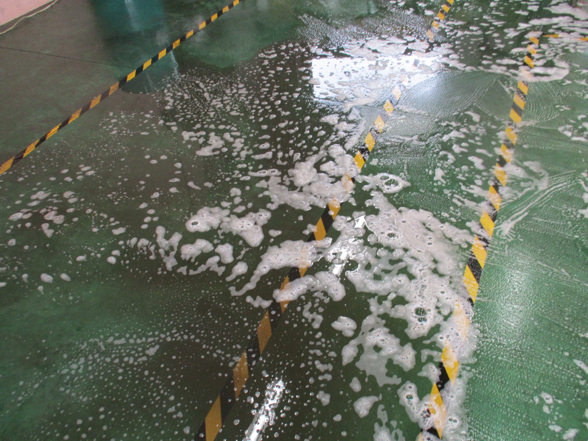 水を撒いて、床用の強力な洗剤で磨いてみると