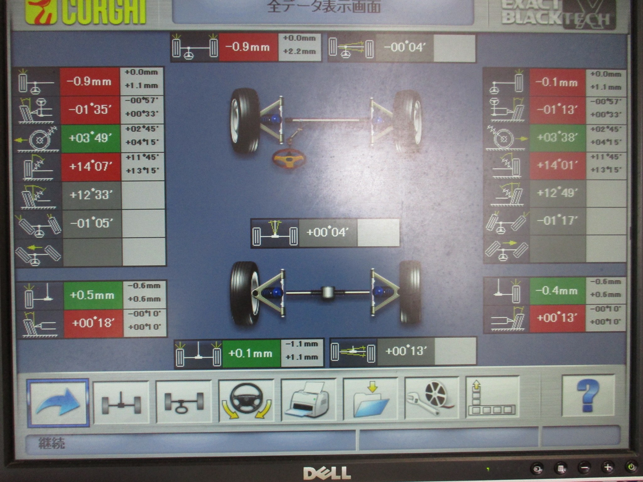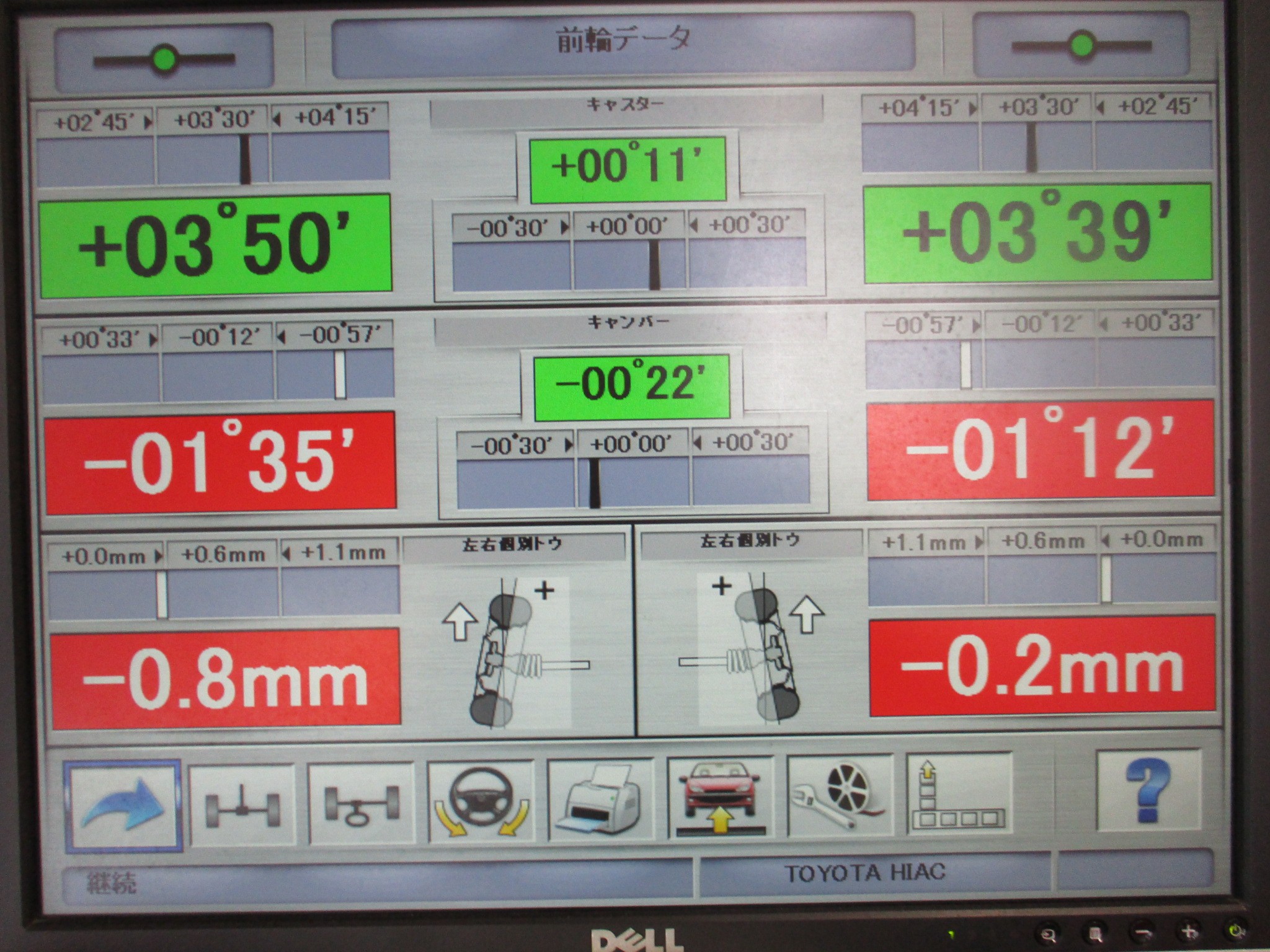キャンバー、キャスターは偏芯カムの関係上、ぴったり基準値とはいきませんでしたが