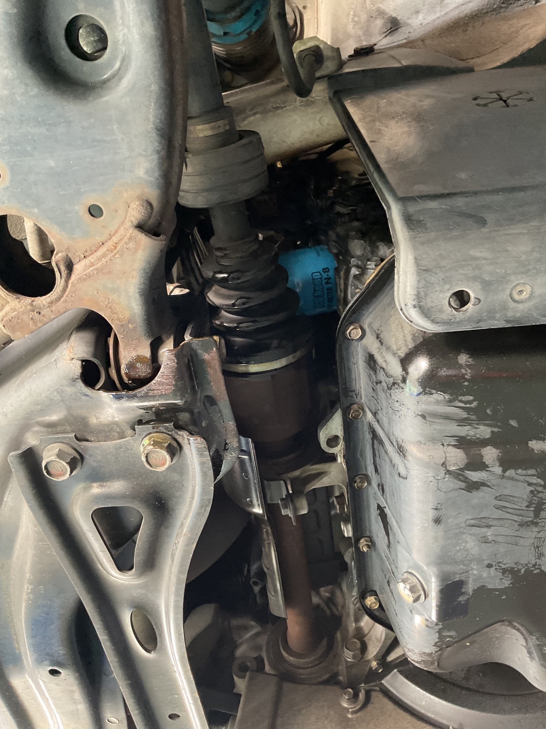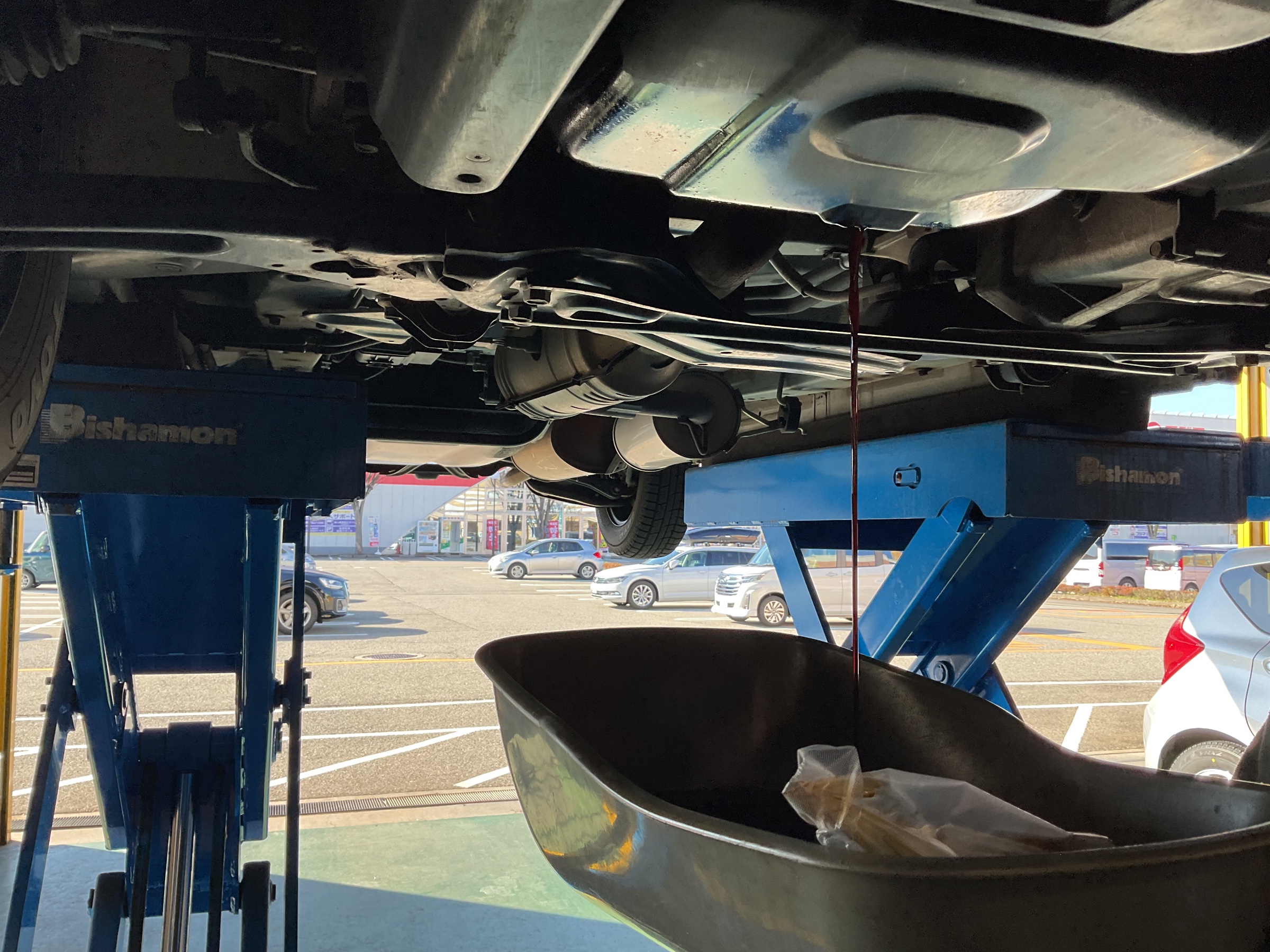 お車をリフトアップして下から古いオイルを抜きます