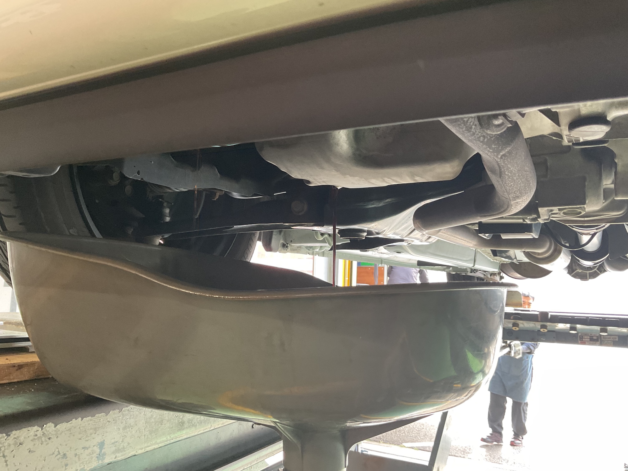 クルマをリフトアップし、オイルが溜まっているエンジンの底部、