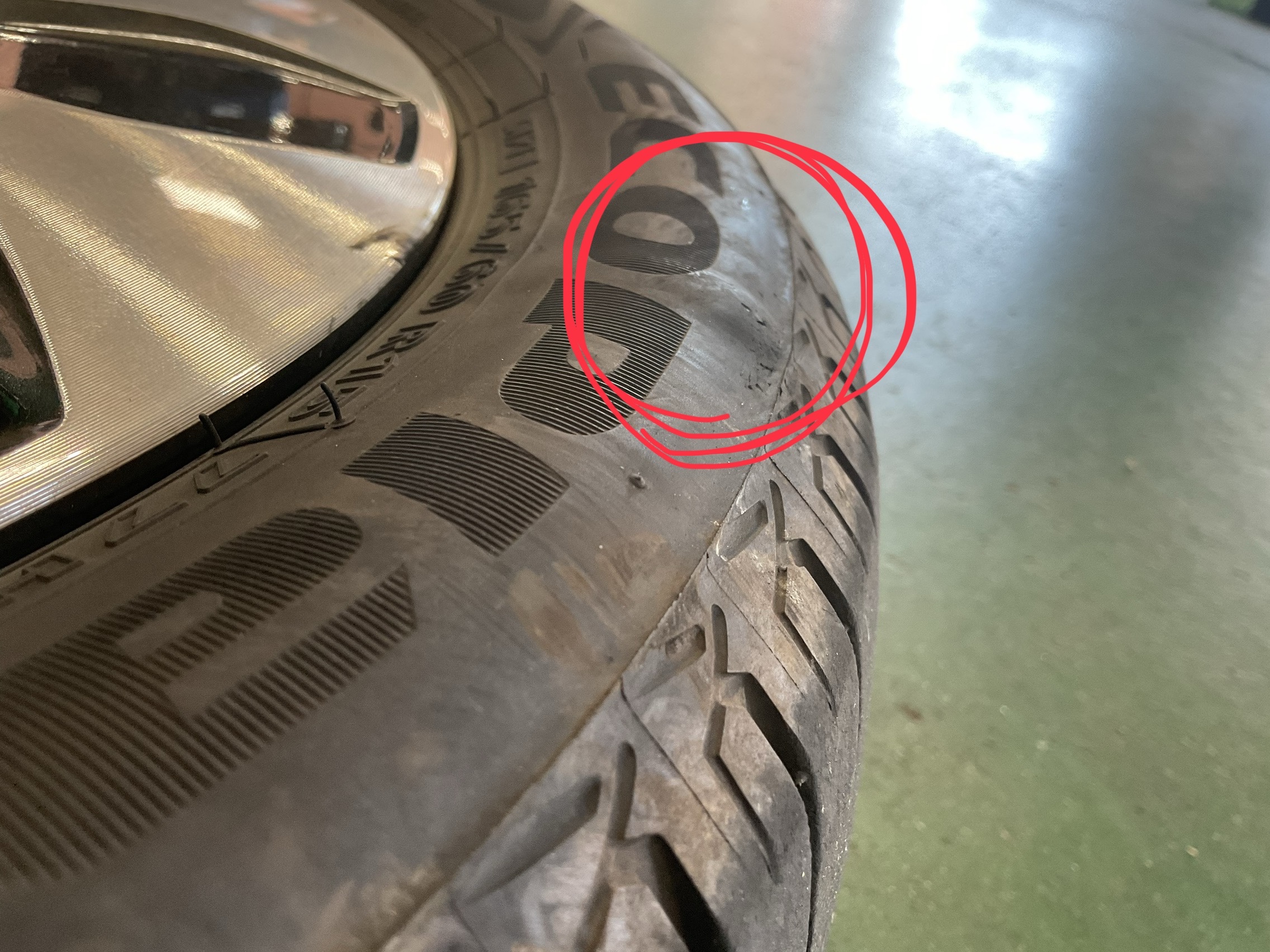 縁石にぶつかったようで確認してみると側面がふくらんでいます