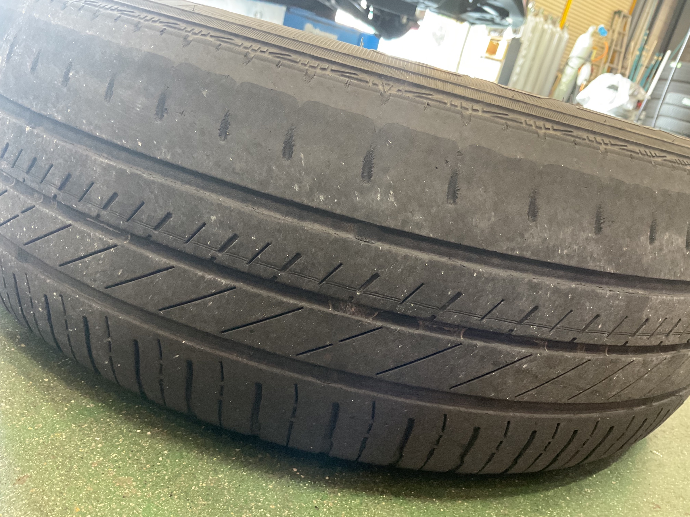 使用中の夏タイヤはタイヤの外側(写真の上の部分)の溝が