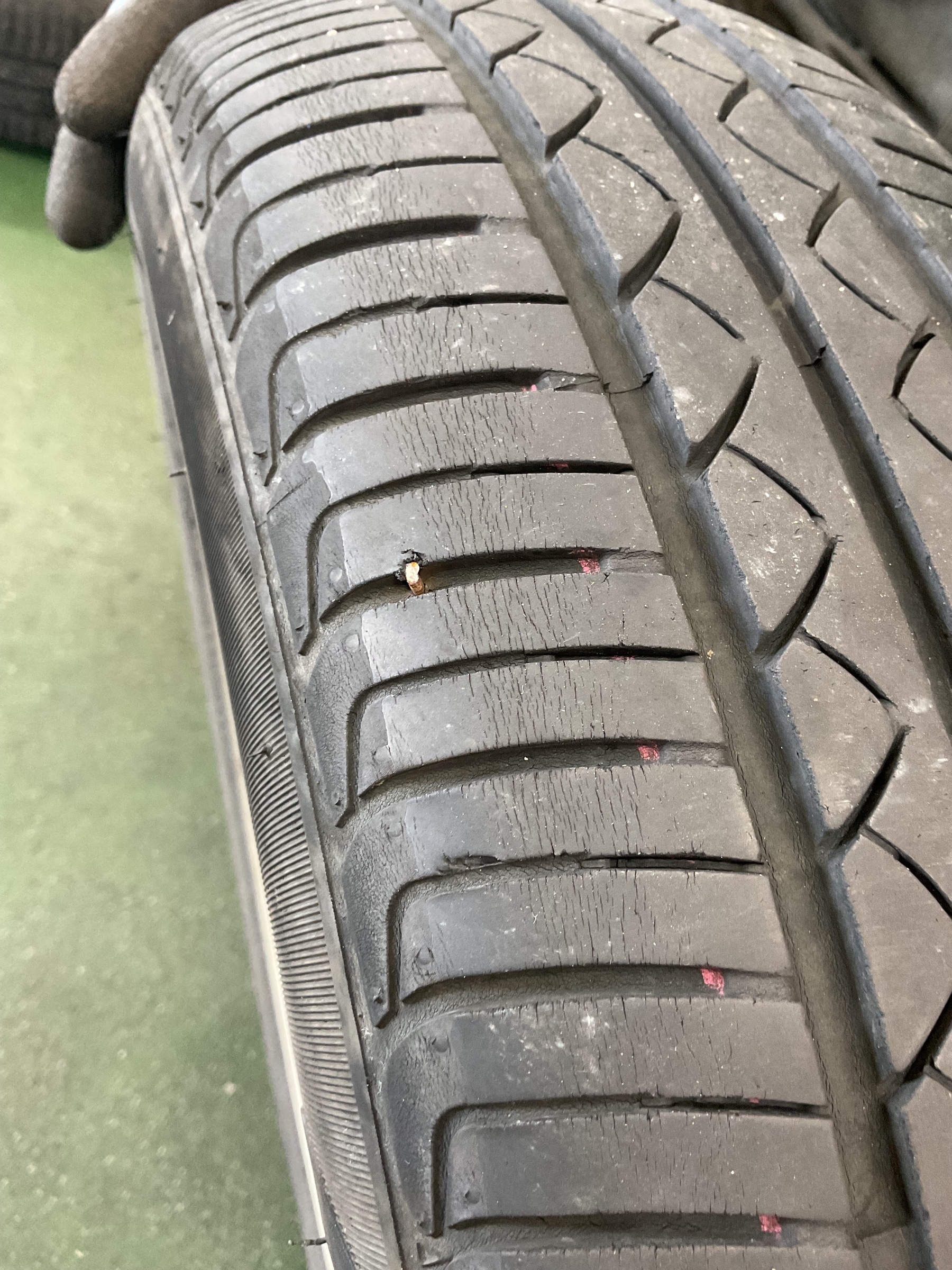 確認してみると釘らしきものが刺さってパンクしていました