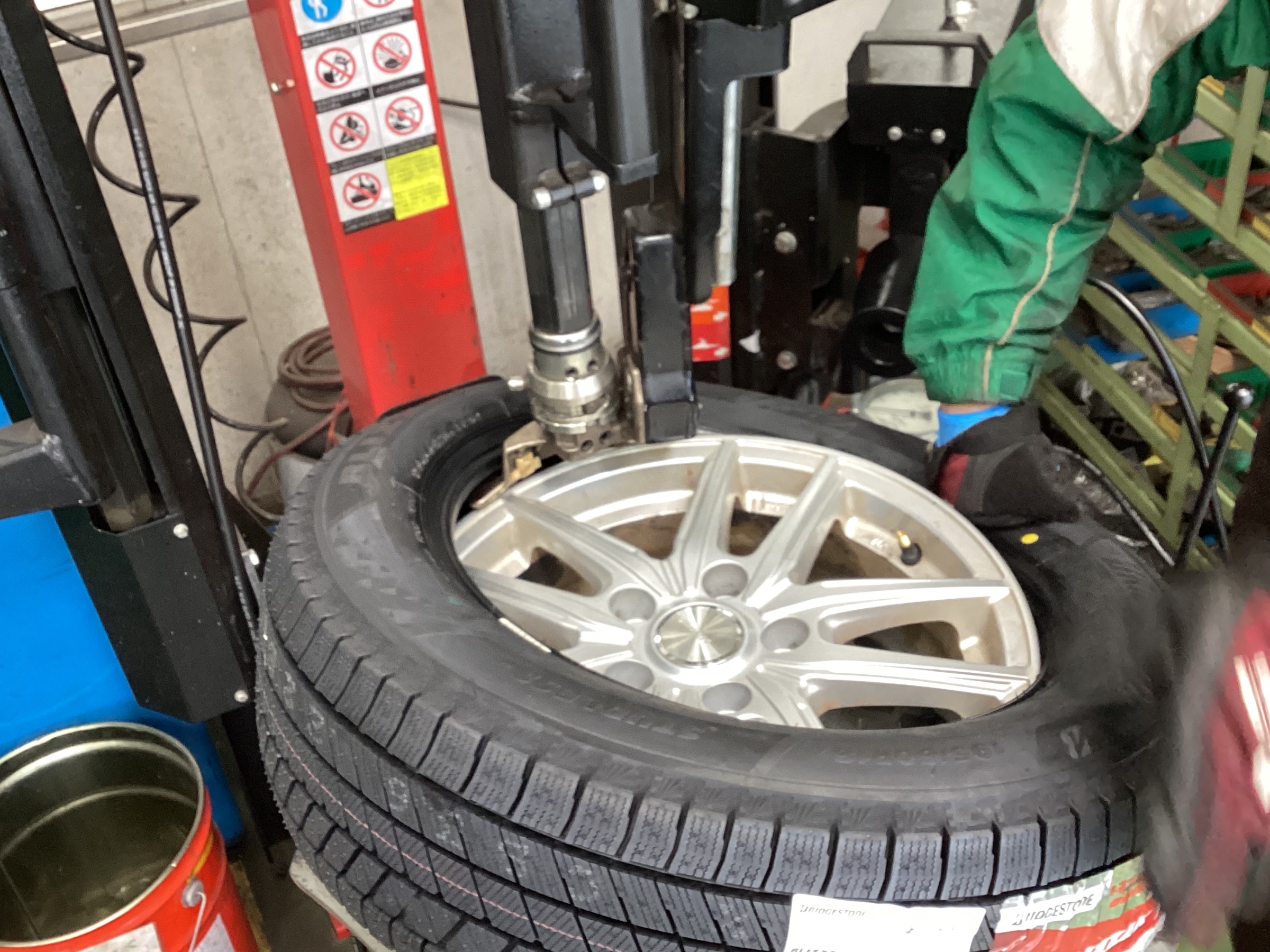 タイヤを用意しアームを下ろしたら、インナー側からゆっくり組みます。