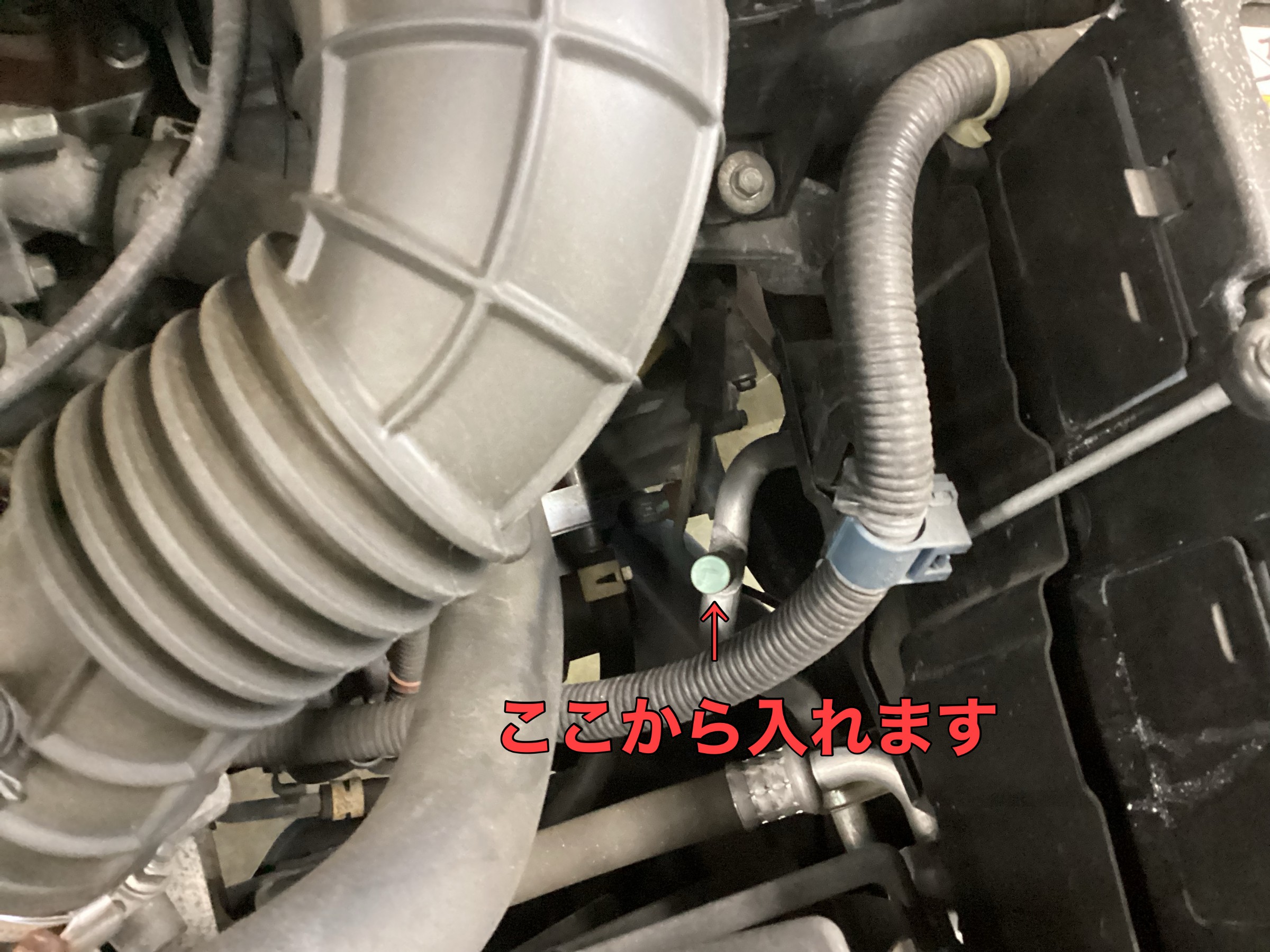 まずエンジンルームを開けてエアコンの配管を探します。