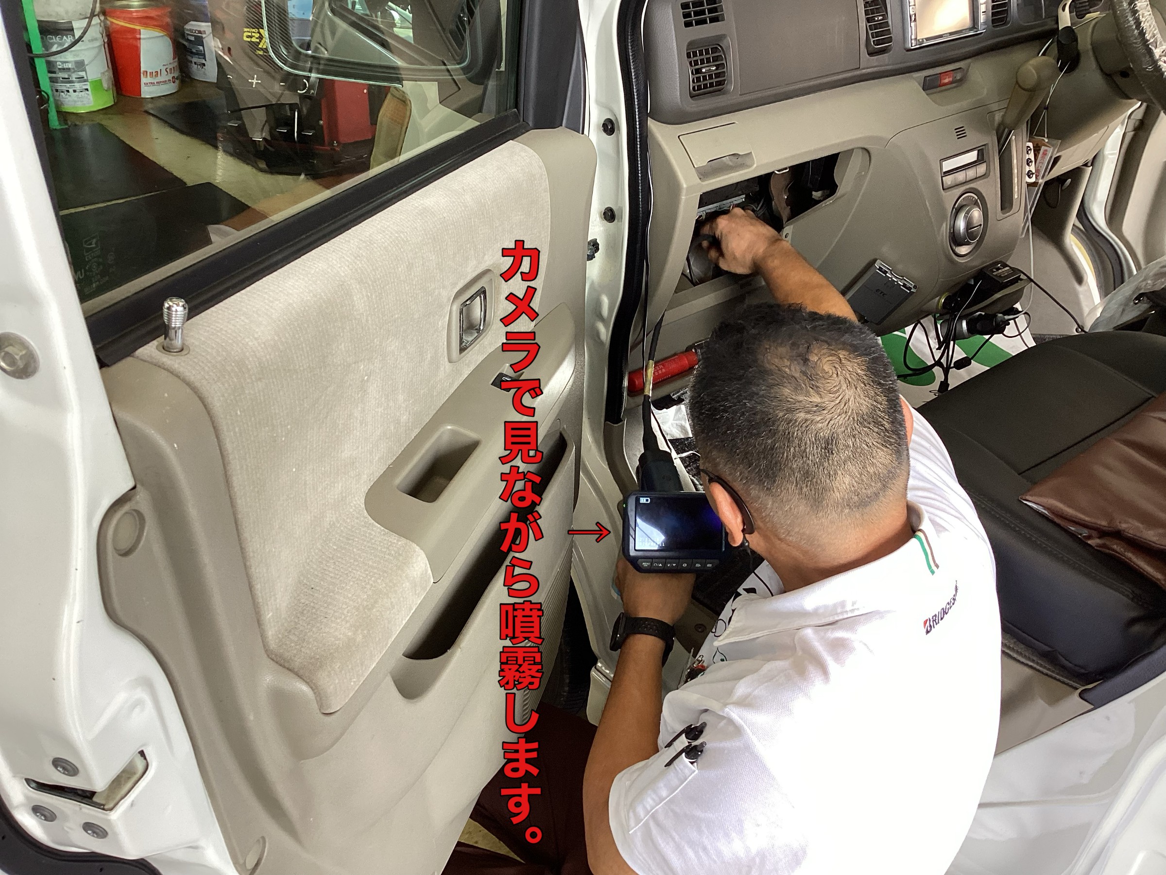 エアダクトにスプレーガンのモニターを見ながらエバポレーターまで差し込み、
