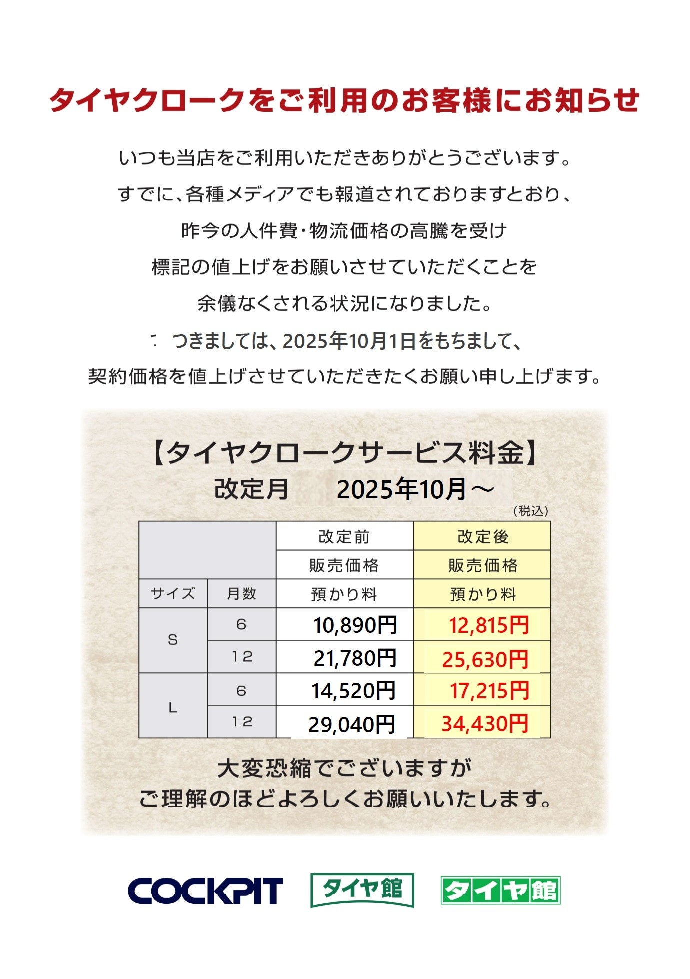 タイヤクロークサービス値上げのお知らせ ポスト 2025年9月6日 タイヤ館府中店をいつもご利用頂き誠に有難う御座います。 すでに、各種メディアでも報道されていますとおり、 昨今の人件費・物流価格の高騰を受け 表記の値上げをお願いさせていただくことを 余儀なくされる状況になりました。 つきましては、2025年10月1日をもちまして、 契約価格を値上げさせていただきたくお願い申し上げます。 大変恐縮でございますがご理解のほどよろしくお願いいたします。 タイヤ館 府中 住所:183-0046東京都府中市西原町2-13-5 電話番号: 042-573-1155 相談予約 カテゴリ:お知らせ