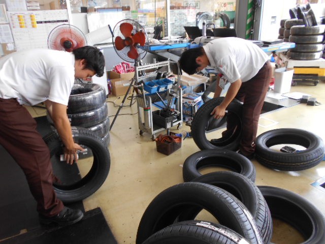 店頭入口付近に展示予定のタイヤを準備している!!