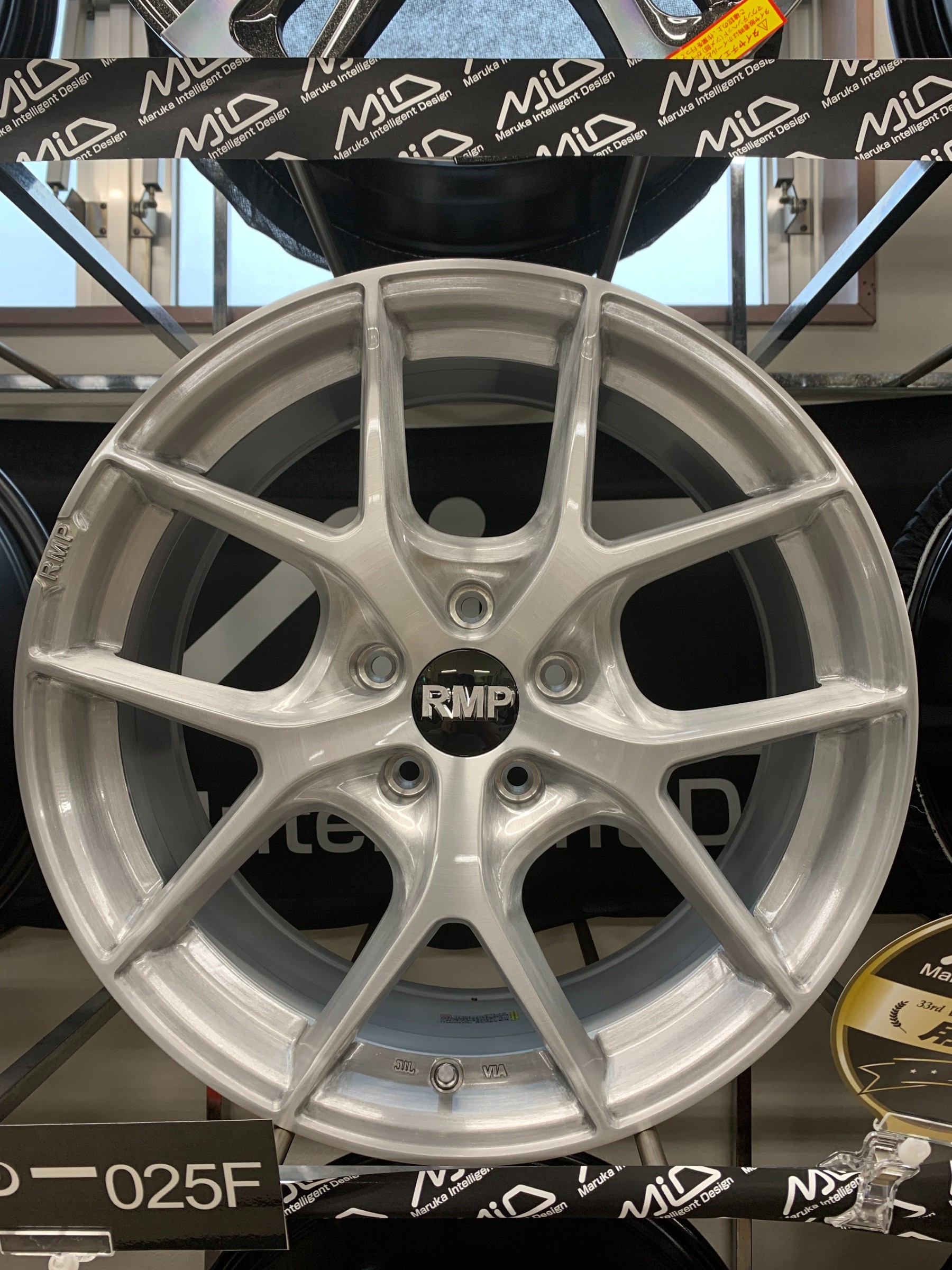 ■スポークサイドの削ぎ落としや天面のワンアクションといったRMPシリーズ独自のディテールを宿しつつ、開口感のある2×5スポークデザインを採用した『025F』。センターオーナメントぎりぎりから美しいアールを描いて立ち上がり、リムフランジいっぱいまで伸びやかに繋がっていく骨格が、実寸以上のスケール感を演出。さらに、スポーク間の股部分(ボルトホール周辺)には3段階の面構成による有機的な造形を与え、中央部の落ち込みを強調するとともに、強靭なリブのような印象を生み出して、ひとつの見せ場としています。天面のフィニッシュには高級感あふれるブラッシュドを選択。これにより、シャープなシルエットと立体的な陰影がより決定的となり、スポーツ性とプレミアム性のハイエンドな融合を実現しています。