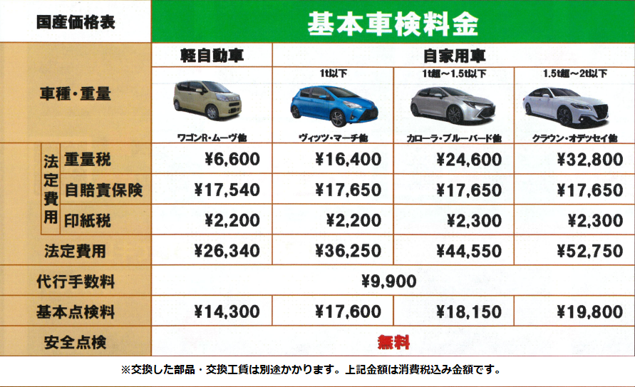 タイヤ館藤枝店の車検基本料金表はこちらになります。