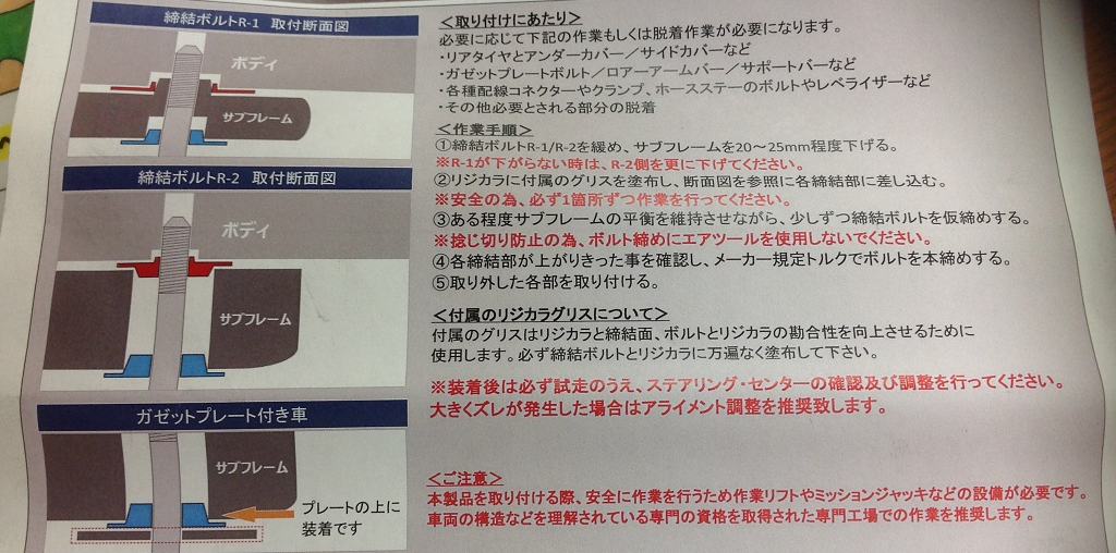※リジカラを取付ける際にメンバーとフレームの位置関係が動く為、ハンドルセンター(トウ)やキャンバーが変化するので、メーカーでも取り付け後のアライメント調整が推奨されております。