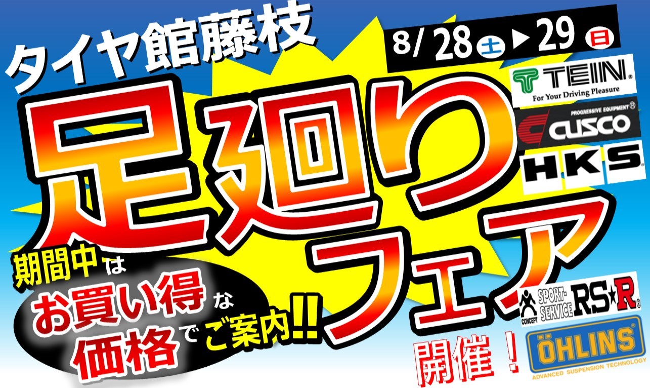 8月28日(土)・29(日)の2日間、「 タイヤ館藤枝 足廻りフェア 」を開催します!