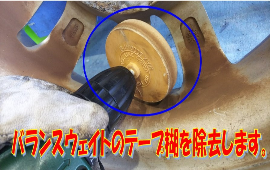 貼付タイプのバランスウェイトを外した箇所には ” テープ糊 ” が残ってしまうので、そのテープ糊も除去します。