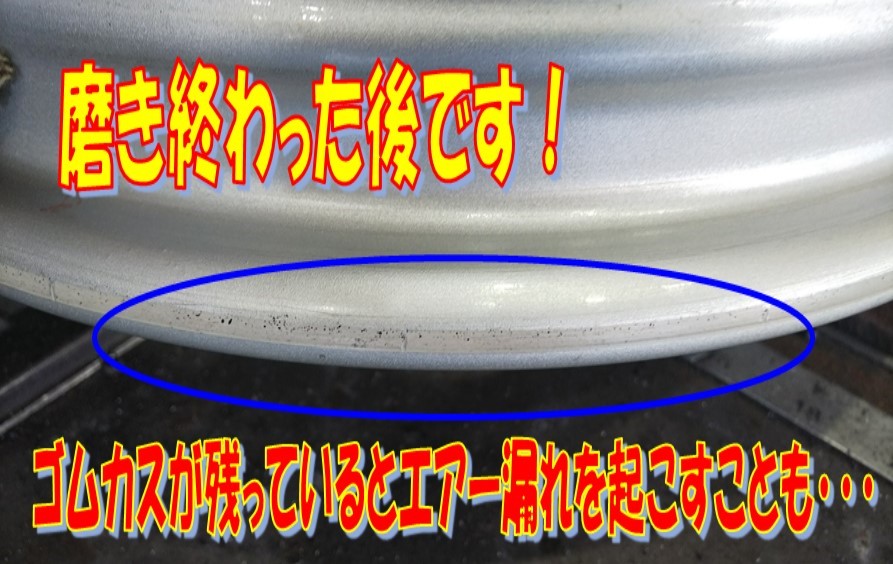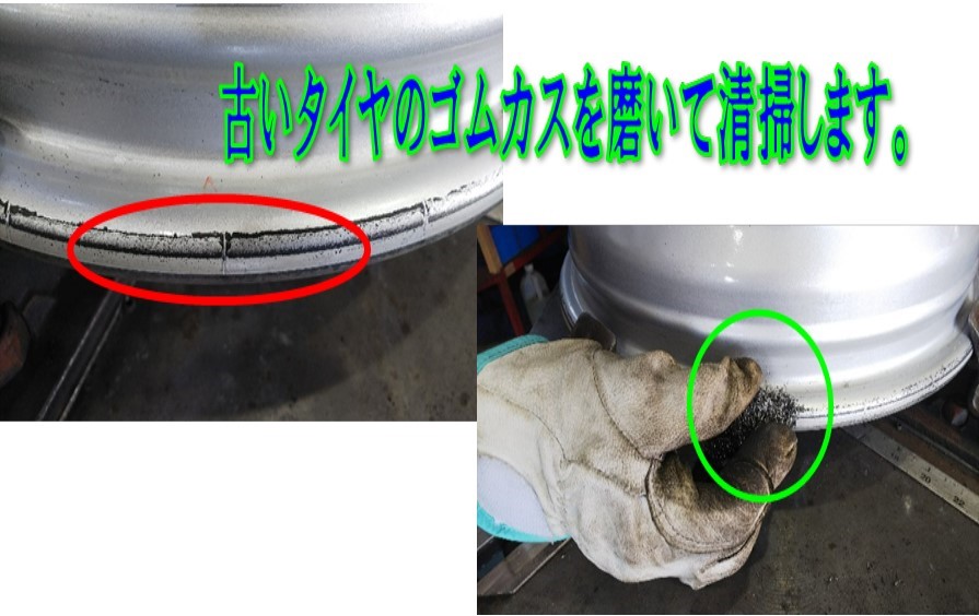 ②ホイールから古いタイヤを外したら、ホイールのリムにこびりついている ” ゴムカス ” を磨いて除去します。