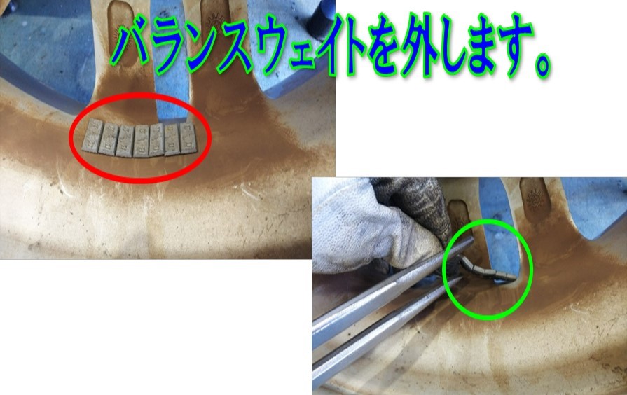 ① 車両からタイヤ(ホイール付き)を外したら、ホイールに付いている 「 バランスウェイト 」を外します。