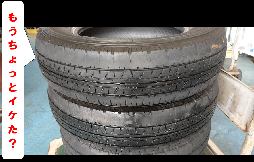 タイヤのセンター部分はスリップサインまで達していませんが内側は溝無し状態(汗