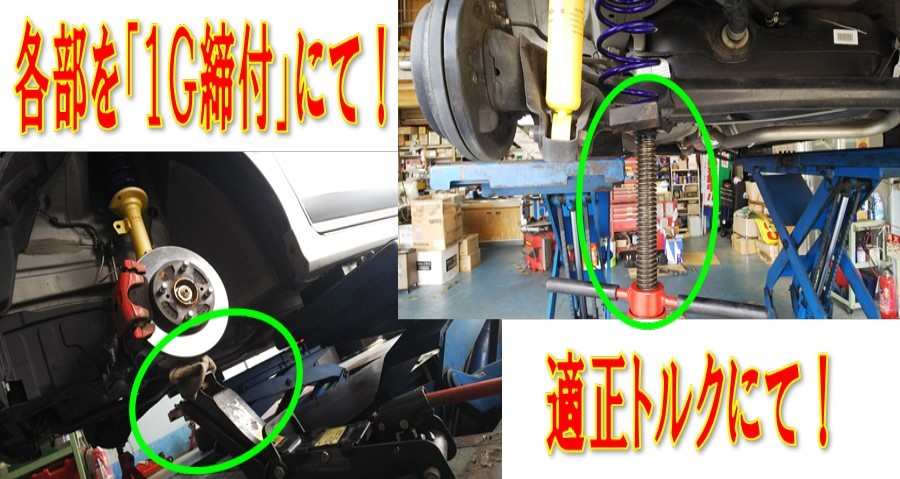 これをやらないと各ブッシュのよじれが発生して、乗り心地の悪化、異音の発生 に繋がりかねません。