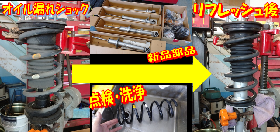 ディーラーさんでの定期点検の際にサスペンションからのオイル漏れに気付き、ショックアブソーバーと併せて周辺部品も合わせての交換修理でした。