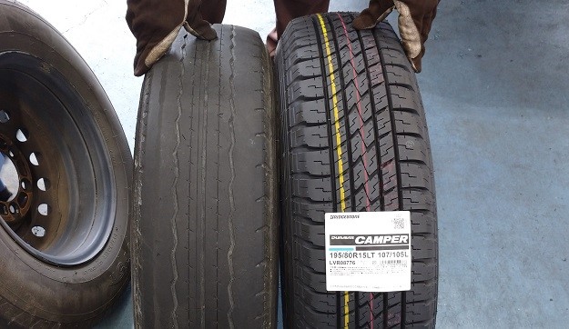 並べて比較してみると…タイヤサイズ表記としては同じ195/80R15ですが太さも外径も少し大きく感じました。