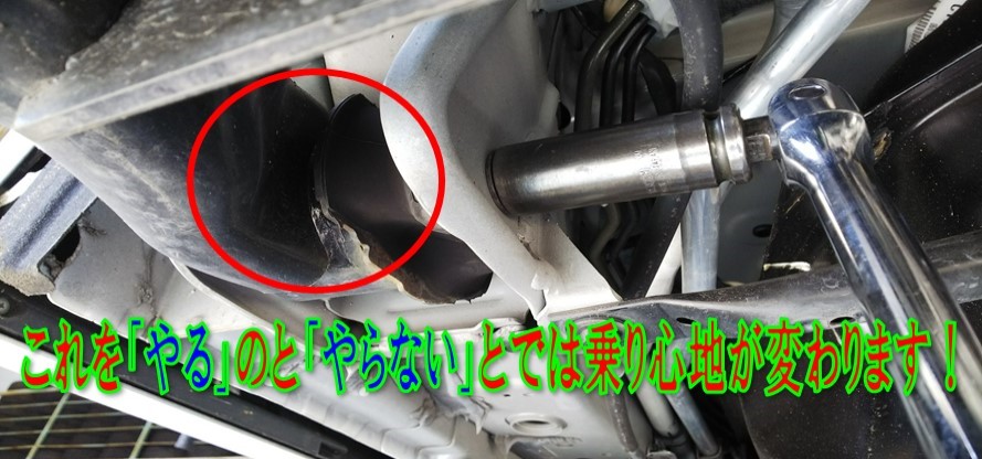 この箇所の締め直しを行なわないと、ブッシュがよじれたまま走行する状態になるので、足がスムーズに動かずに乗り心地悪化・・・