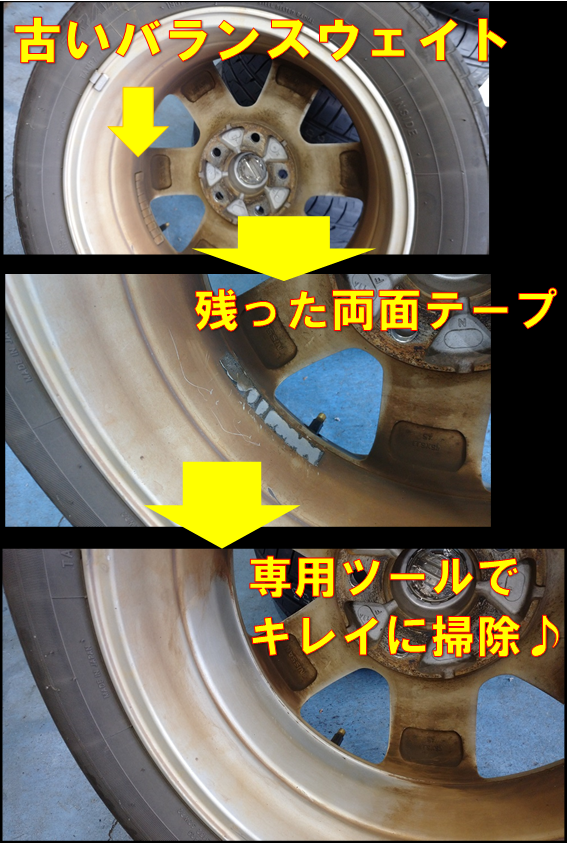 当店ではホイール内側に付いた古いバランスウェイトを外したあと、残った両面テープや汚れを可能な限り清掃いたします!!