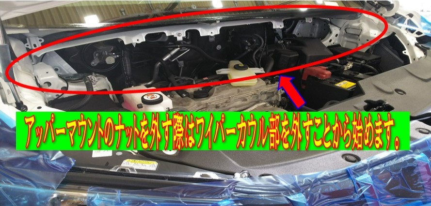 30系アルファード(ヴェルファイア)はショックを外す為にアッパーマウントのナットがエンジンルームの奥まった箇所にあるので、ワイパーカウル部を全て取り外す事から始めます。
