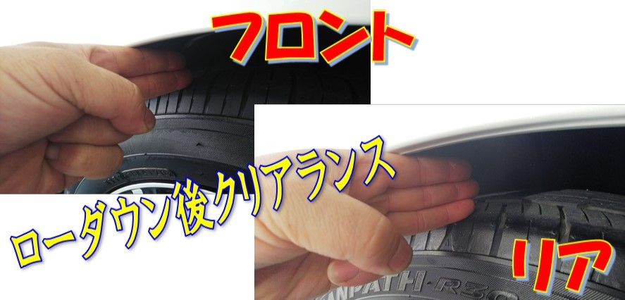 ローダウンするにあたり、タイヤとフェンダーのクリアランスを測っておいて、お客様には解りやすい様に拳(指)を当てがって画像を残しておきます。⇒ 納車時にお客様に違いを画像で見てもらっています。