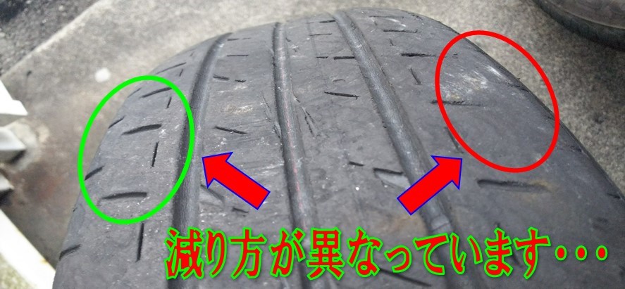 1本のタイヤを見ると、内側と外側とで減り方が異なっている状態でしたので、タイヤ交換と一緒に " アライメント調整 " のご案内をさせていただきました。