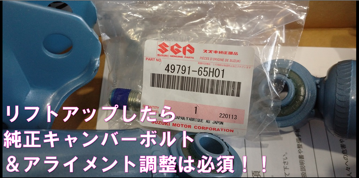 ちなみに車高アップしてなくてもタイヤの外減りが気になったり、直進性に不満がある方はこのボルトでアライメント調整すると良い感じになることが多いですよ~♪