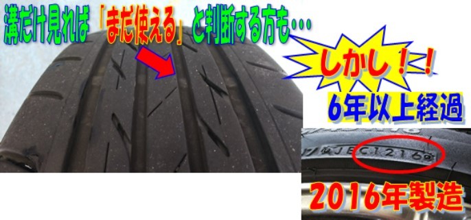 タイヤの溝が残っていても、タイヤのゴムは年数が経過すると共に硬くなってしまいます。