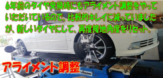 このような症状がある場合、アライメント調整 でタイヤの接地角度をリセットしてあげないと何度タイヤを交換しても結果は変わらないのです。