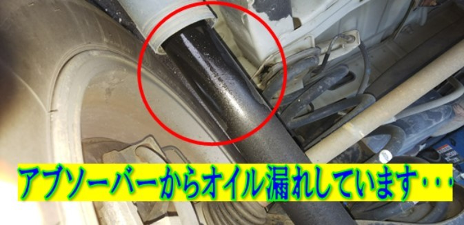 今回の作業中に発見したのですが、車を支えてる足回り部品/ショックアブソーバーからオイルが漏れていました。