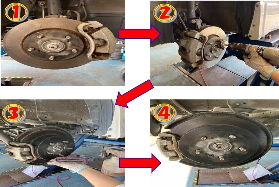 仕上げは、これまで使用されていたタイヤが左右で明らかな減り方の違いが見受けられたので、アライメント調整 で ” タイヤの接地角度をリセット ”