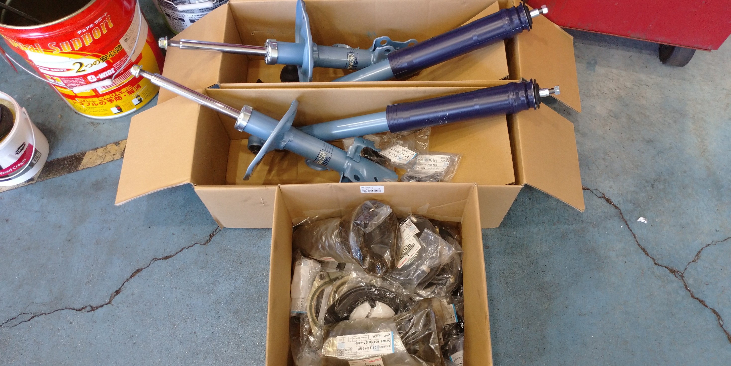 フラ付きや異音の原因になるポイントを点検し、今回はショックアブソーバーとマウントやバンプストッパーなど周辺部品も併せて交換させていただきました。