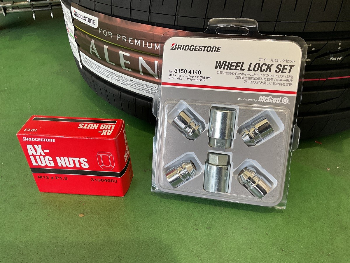 タイヤホイールセットを通常のナットと一緒に盗難防止用のロックナットで取り付けしていきます!