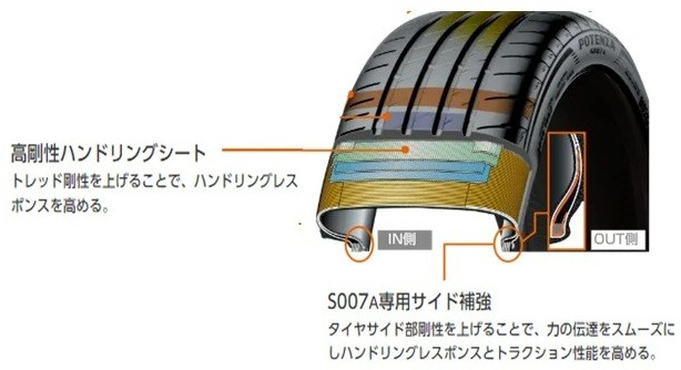 POTENZA S007A の方が同じタイヤサイズ表記でも太くなっているのです。