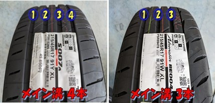この本数の違いが「 ウェット性能(排水性)」の差にもなっています。
