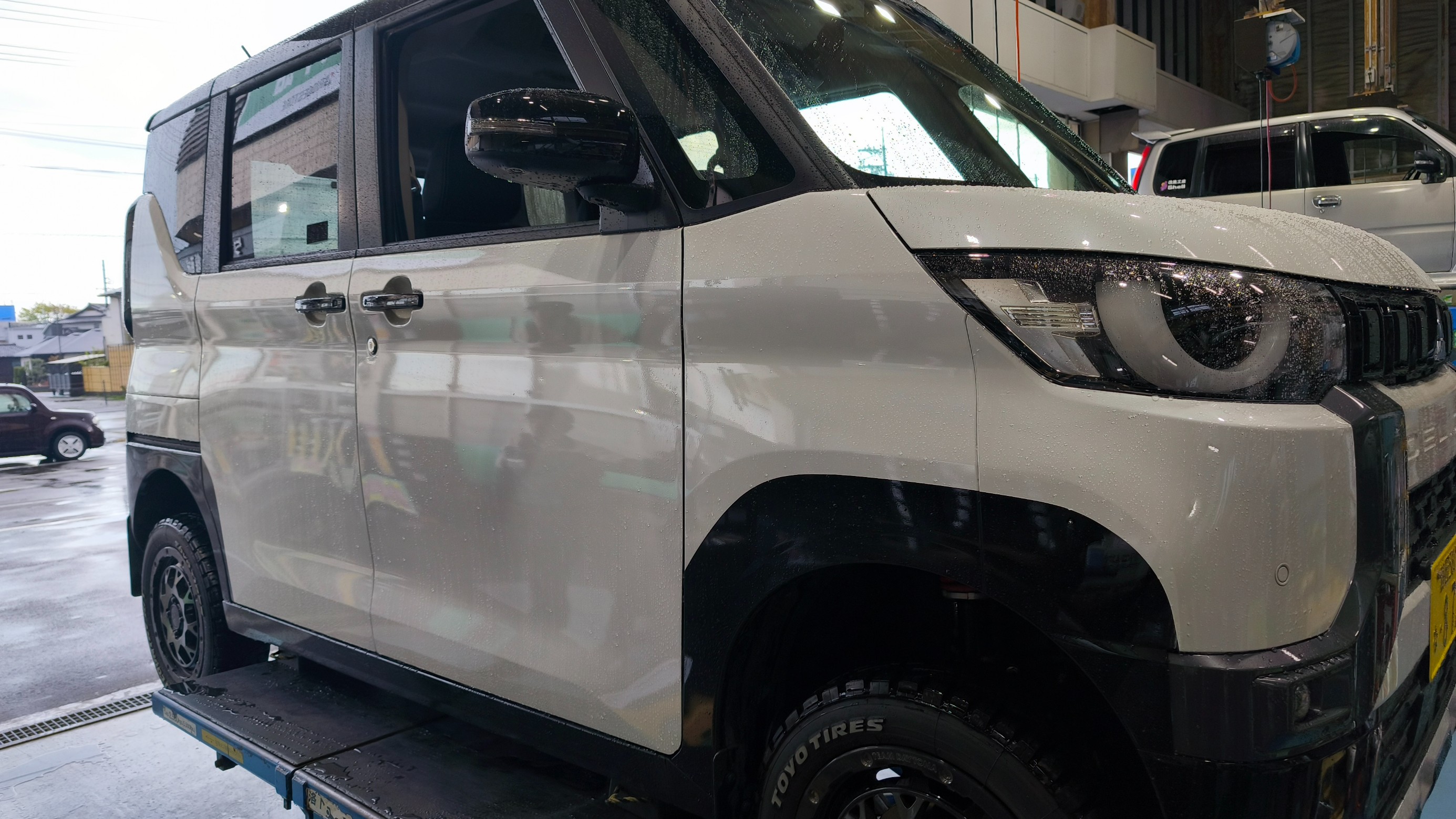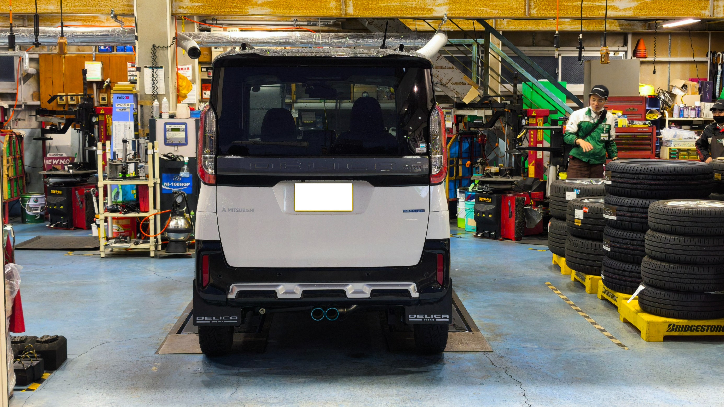 こちらのデリカミニは以前にリフトアップとホイールも交換させてもらいましたが、今回はマフラー交換を追加でご依頼いただきました。