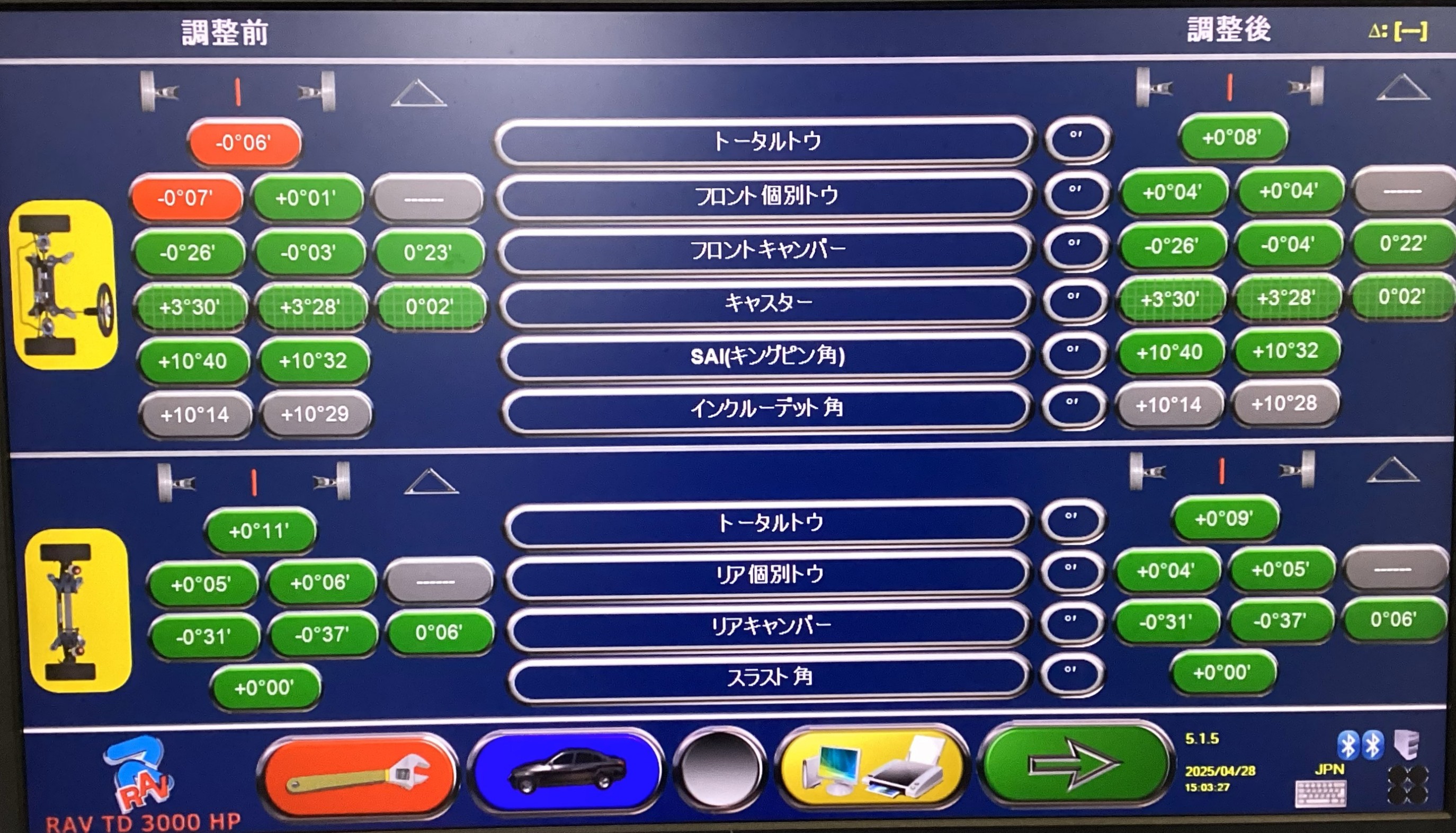 その後、ステアリングを真ん中に固定して測定完了です。