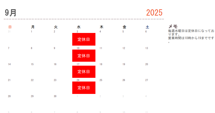 9月の営業カレンダー