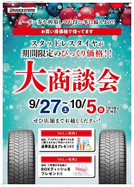 こんにちは、タイヤ館福井文京の松浦です! ようやく暑さもひと段落して、秋の気配が感じられるようになりました。 ということで、この季節がやってきました!! 9月27日(土)~10月5日(日)までの9日間、タイヤ&ホイールの大商談会を開催します!! 豪華な特典をご用意して皆様のご来店をお待ちして...