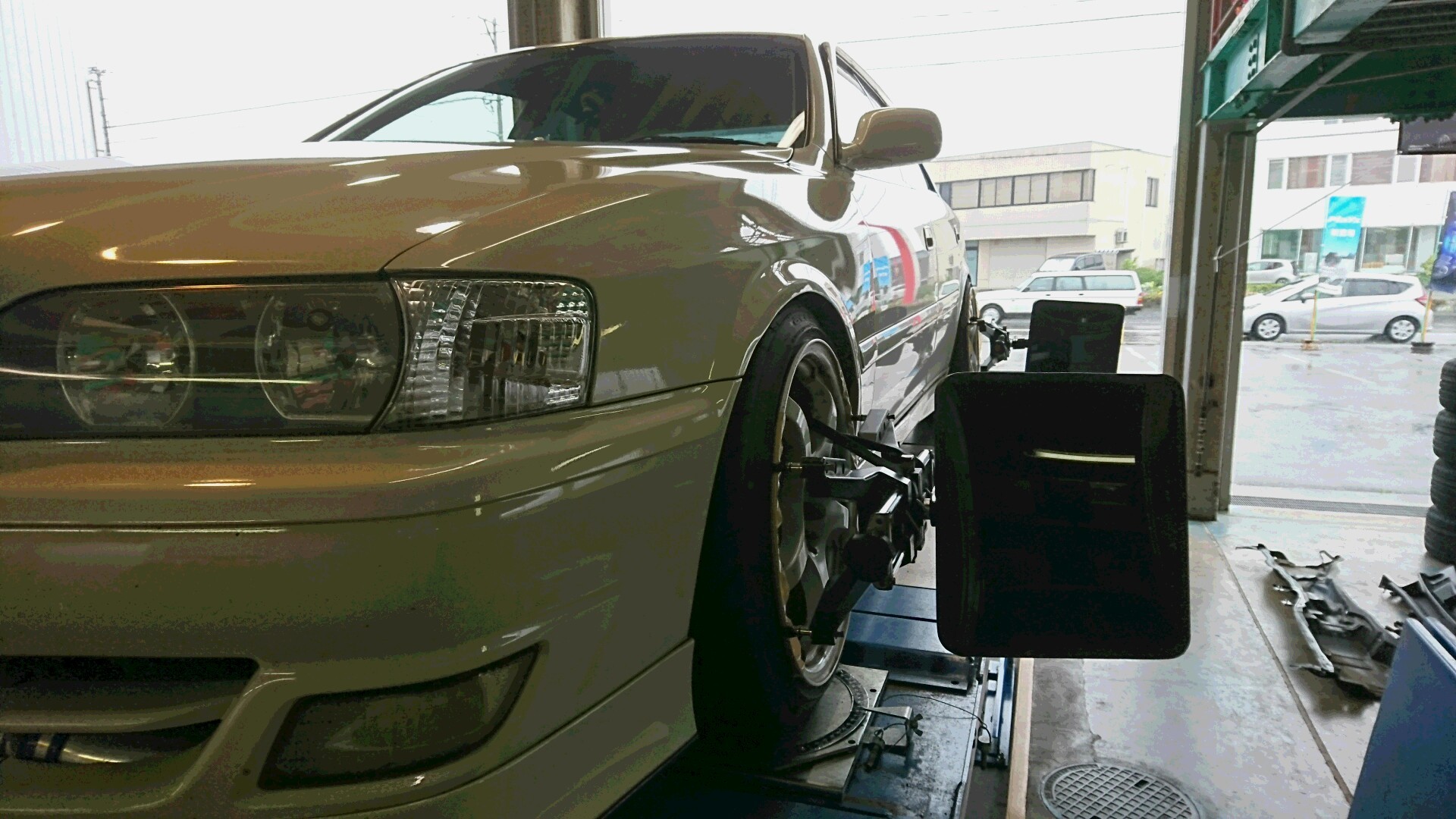 JZX100チェイサーのアライメント調整です。チェイサーはリアトー&リヤキャンバーとフロントトー&フロントキャンバーが調整可能です。ピシッと調整させて頂き納車いたしました。チェイサーの1JZサウンドは、いつ聞いてもいい音です。(^^♪